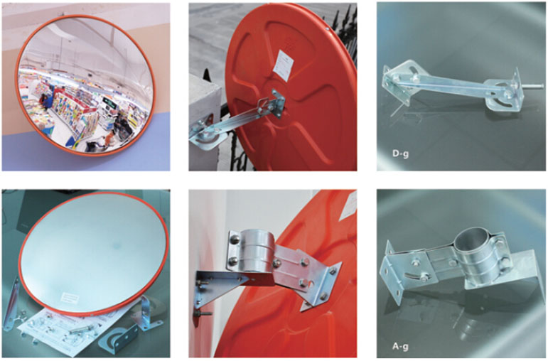 Indoor convex mirror with orange mirror back adjust to any angle to allow an optimal line of sight. The Indoor-Outdoor convex mirror can be positioned wherever goods are concealed from view by shelving or partitions, and on the end of shelving units and near check outs. It is ideal for sheltered outdoor and industrial situations such as warehouses, hospitals or any other situation where blind spots are present- like parking lot, garage, school, storage and factory etc. The mirror face is made of 2mm acrylic, or thinner polycarbonate. Due to the galvanized steel installation parts, the products can be adjust 360 degrees freely. The edge banding, made of aluminum alloy, promises good sealing and steady mirror face.
