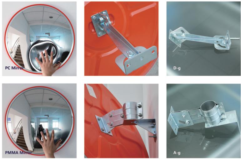 Indoor convex mirror with orange mirror back adjust to any angle to allow an optimal line of sight. The Indoor-Outdoor convex mirror can be positioned wherever goods are concealed from view by shelving or partitions, and on the end of shelving units and near check outs. It is ideal for sheltered outdoor and industrial situations such as warehouses, hospitals or any other situation where blind spots are present- like parking lot, garage, school, storage and factory etc. The mirror face is made of 2mm acrylic, or thinner polycarbonate. Due to the galvanized steel installation parts, the products can be adjust 360 degrees freely. The edge banding, made of aluminum alloy, promises good sealing and steady mirror face.